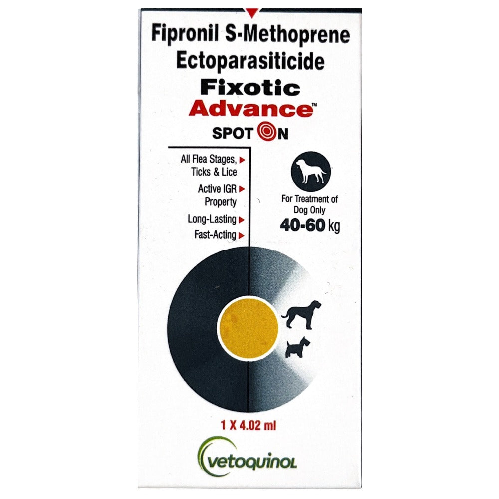 Fixotic Advance Spot-On is a fast-acting flea and tick treatment for dogs weighing up to 10kg, formulated with Fipronil and S-Methoprene. It successfully eliminates fleas, ticks, and lice at all phases of development while preventing re-infestation. The easy-to-apply spot-on solution offers long-lasting protection to keep your pet secure and comfortable.