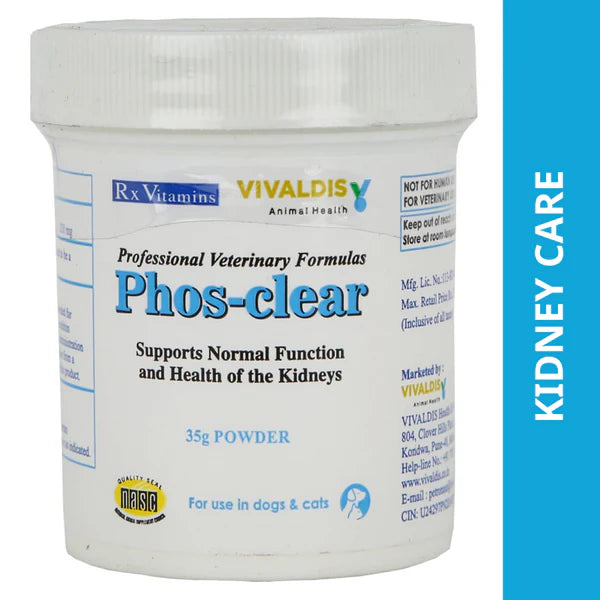 Phos-clear is for the management of phosphatemia or increased serum phosphorus levels in dogs and cats suffering from chronic kidney disease or CKD. Persistent hyperphosphatemia along with calcitriol deficiency leads to secondary hyperparathyroidism. Phos-clear helps to control hyperphosphatemia by reducing phosphorus absorption from the intestine hence plays its part in controlling the development of secondary hyperparathyroidism.