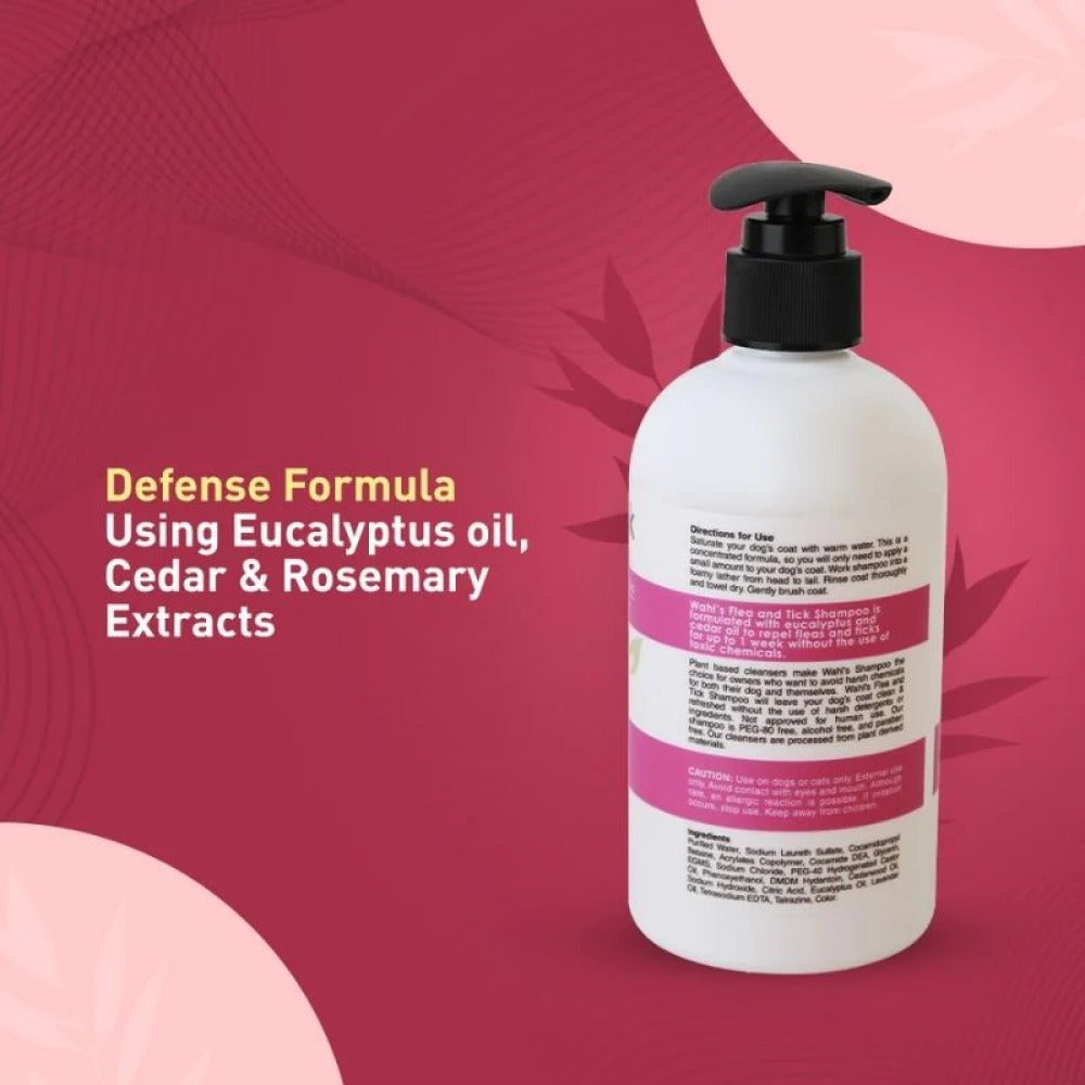 Wahl's Flea and Tick Shampoo is formulated with eucalyptus and cedar oil to repel fleas and ticks for up to one week without the use of toxic chemicals. Plant based cleansers make this shampoo the choice for pet owners who want to avoid harsh chemicals for both their dog and themselves. This shampoo will leave your dog's coat clean and refreshed without the use of harsh detergents.
