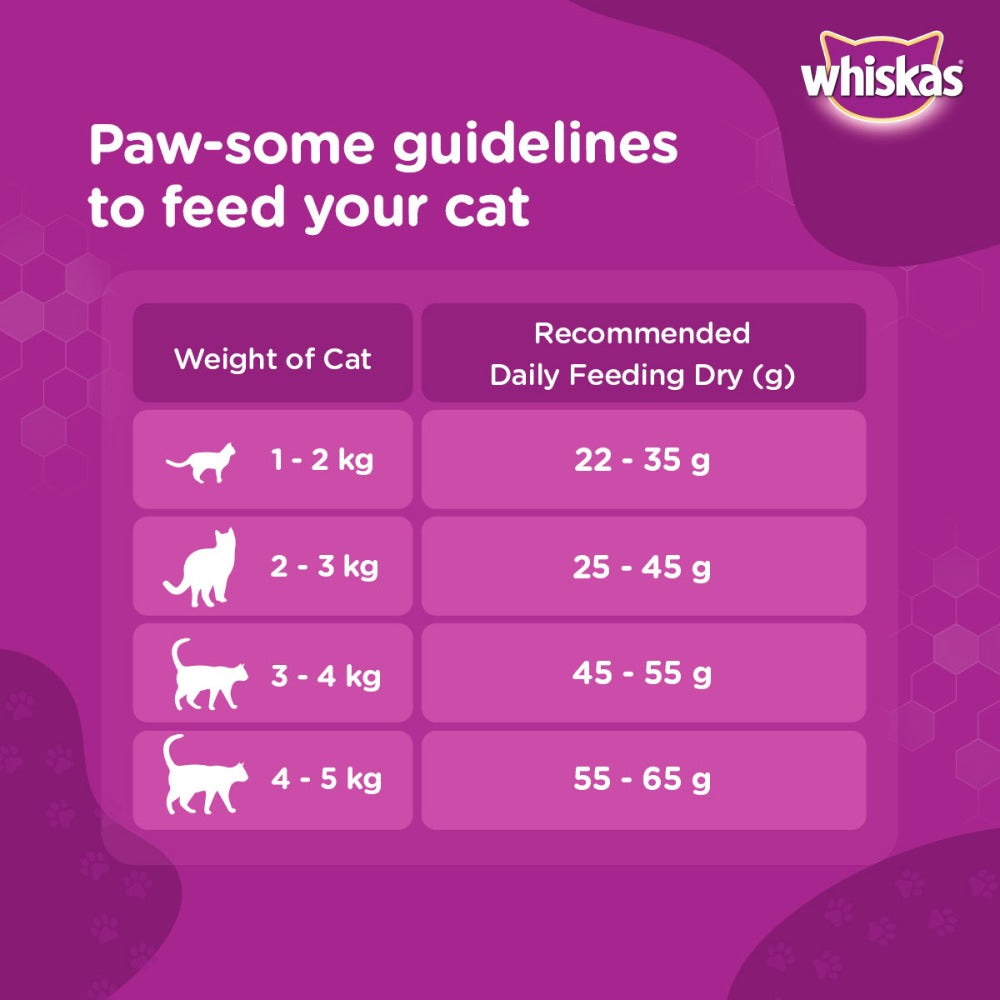 Serve Whiskas according to your cat's body weight, following the recommended daily portion.