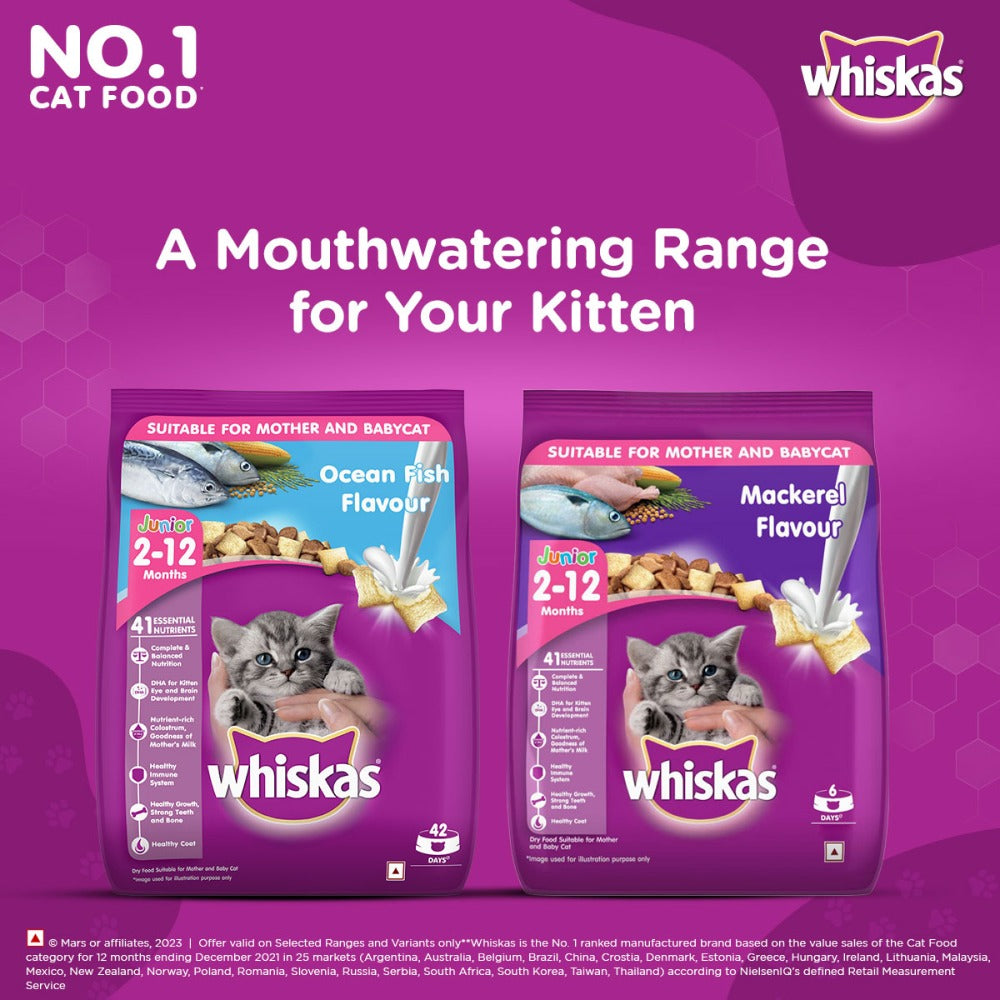 Whiskas cat food comes with the nutrition that your kitten needs for a long, healthy, and playful lifestyle. Whiskas Kitten Dry Cat Food, Ocean Fish Flavor is a complete and balanced diet for kittens from 2 to 12 months old, giving them healthy growth, and energy to be lively and active. This Whiskas dry food is also suitable for mother cats. Packed with quality ingredients and delicious ocean fish flavor, the food contains 41 essential nutrients that support your kitten's vital system and immune system. It contains colostrum with essential nutrients found in mother's milk. DHA, a nutrient found in mother's milk, supports your kitten's eye and brain development. Calcium, Phosphorus, and Vitamin D promote healthy growth, strong teeth, and bones. Omega-6 fatty acids and zinc keep your kitten’s coat healthy. We work in collaboration with the Waltham™ Pet-care Science Institute for Pet Nutrition to consistently give cats the proper nutritious care. Our meals are nutritionally complete and balanced while brimming with the deliciousness your cat loves. Whiskas ensures that your feline friend's mealtime is filling and fun!