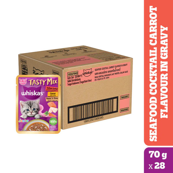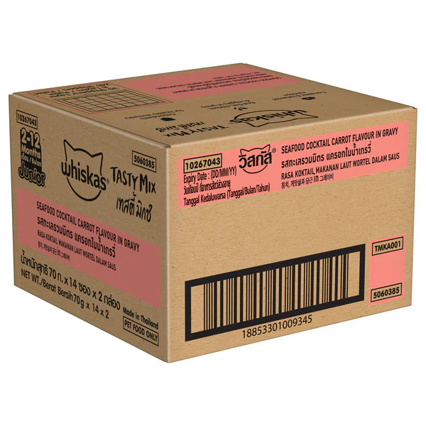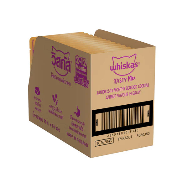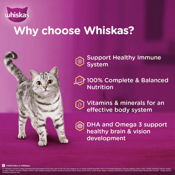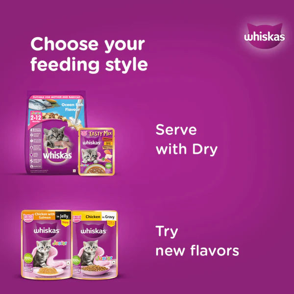 Whiskas wet cat food provides the nutrition your kittens need for an active life and supports healthy growth. Whiskas Tasty Mix Kitten (2-12 Months) Wet Cat Food, Chicken Tuna with Sweet Potato in Gravy, provides 100% complete and balanced nutrition. It is designed to take care of your kitten's daily nutritional & moisture requirements required for healthy kitten development. It contains a delightful blend of chicken, tuna, and sweet potato in gravy. It supports a healthy immune system. It is packed with vitamins and minerals for an effective body system. DHA and Omega 3 support healthy brain and vision development. The gravy format and moisture content in this wet food support hydration. Whiskas gravy food’s texture and aroma appeal to the palate of your feline and attract even fussy eaters. We work in collaboration with the Waltham™ Pet-care Science Institute for Pet Nutrition to consistently give cats the proper nutritious care. Whiskas cat food meals are nutritionally complete and balanced while brimming with the deliciousness your cat loves. Whiskas ensures that your feline friend's mealtime is filling and fun!